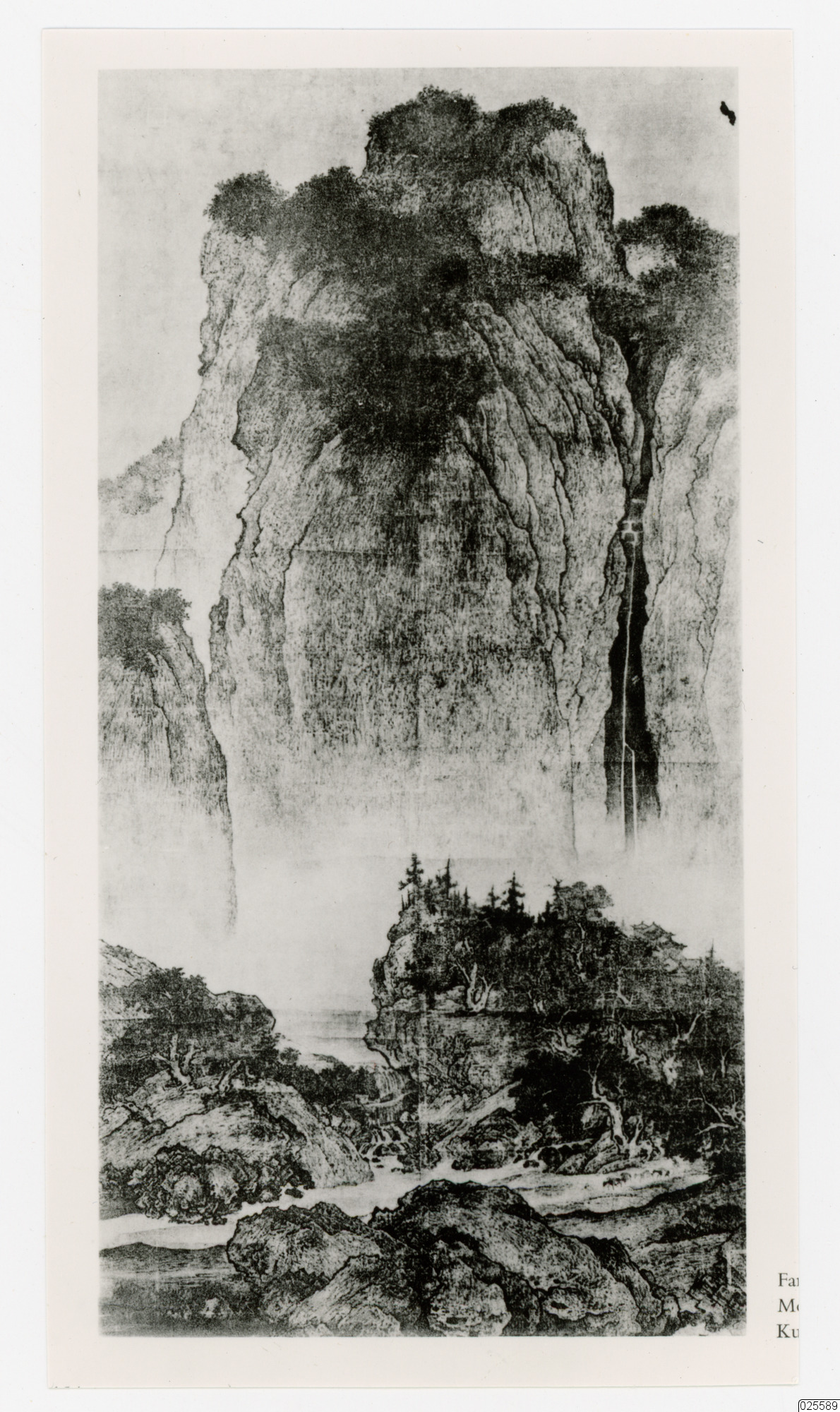 Målning föreställande resenärer bland berg och bäckar av Fan Kuan (1000-talet e.Kr.). Bläck och pigment på pappersmonterat siden.