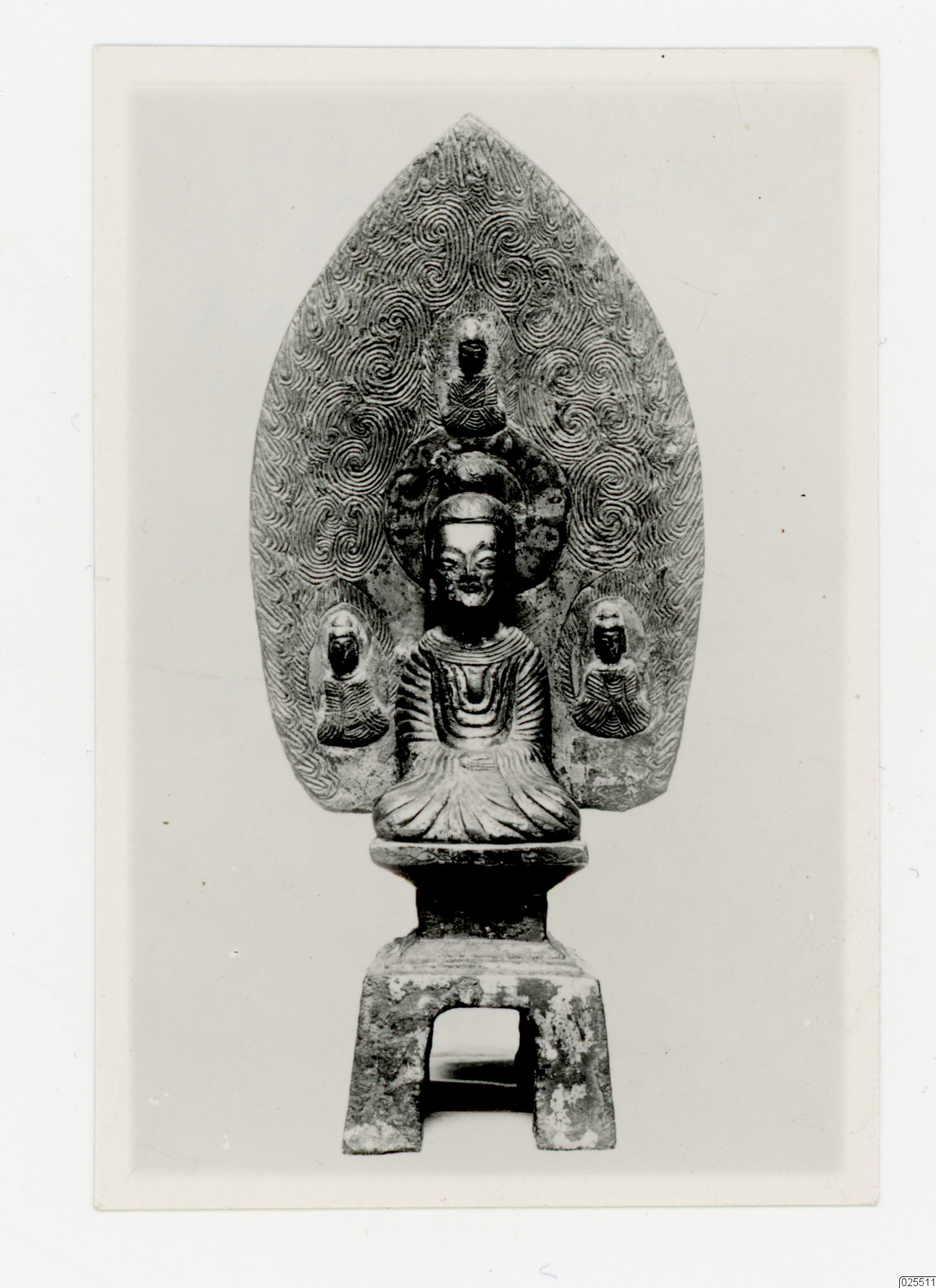 sakyamuni buddha. Sittande på en fyrbent piedestal, i meditationens mudra, med en stor lövformad gloria graverad med virvlar och lågor. 437 e.Kr., Södra Songdynastin.