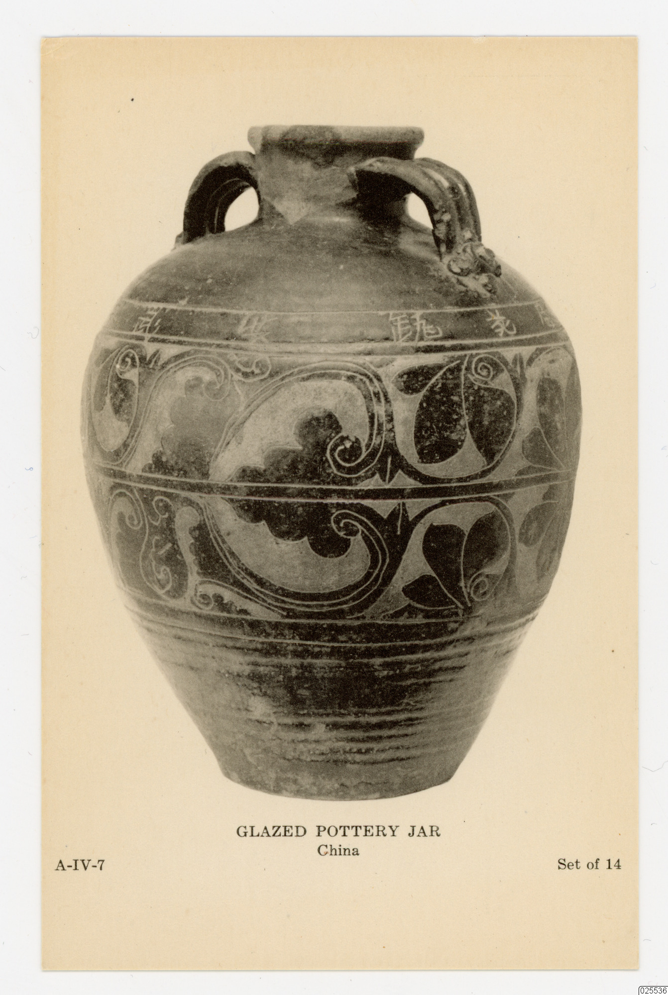 En glaserad keramikkruka. Dekorerad med två band av ornamentala bladmönster utskurna ur den mörkbruna glasyren. Försedd med en inskription som anger datumet 1393 e.Kr. Kina, tidig Ming-period.