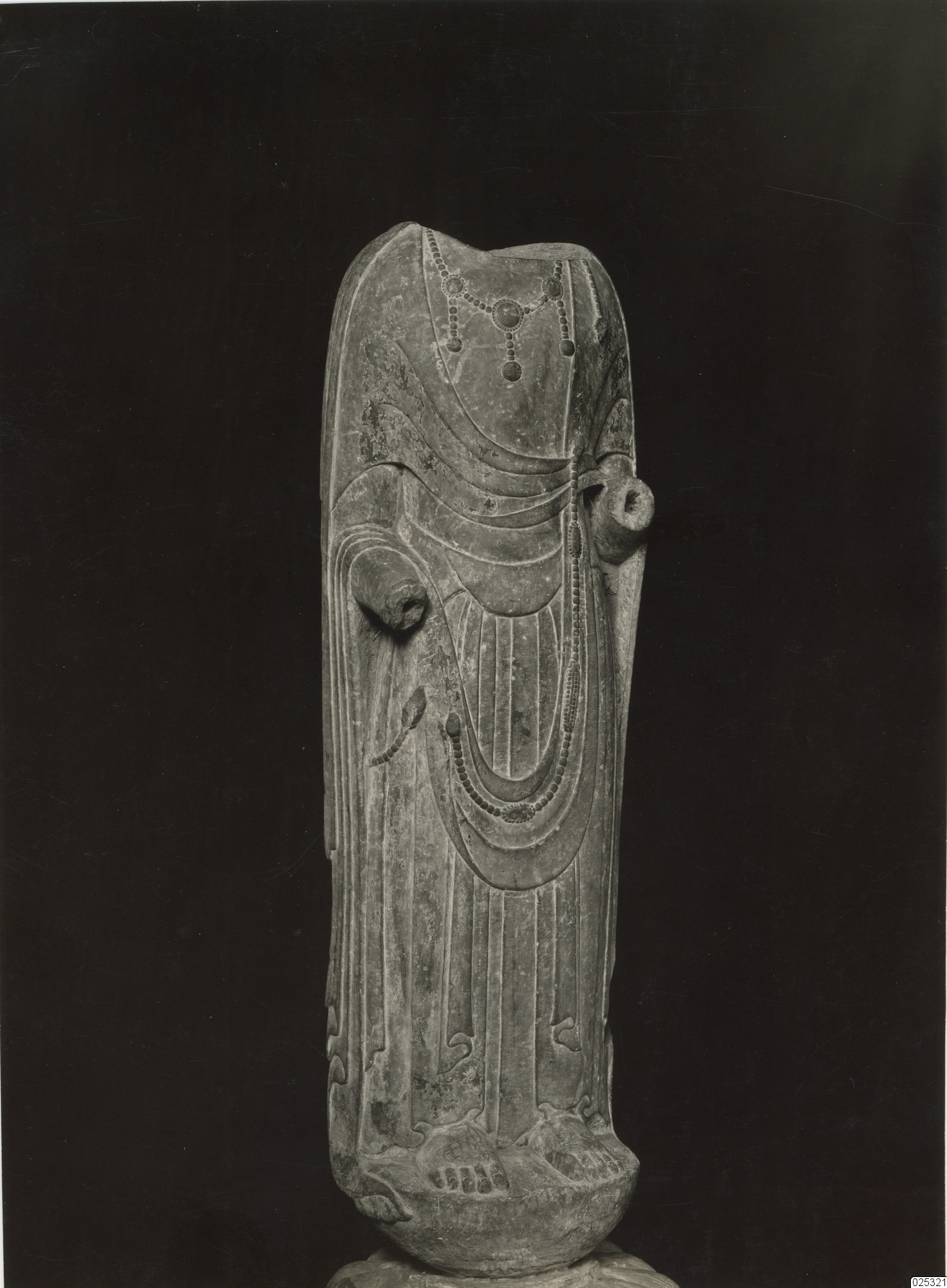 Stående Guanyin Bodhisattva, huvudet och båda händerna avbrutna. Den slätt fallande dräkten bildar tunna ornamentala veck. Sui perioden, början av 600-talet.