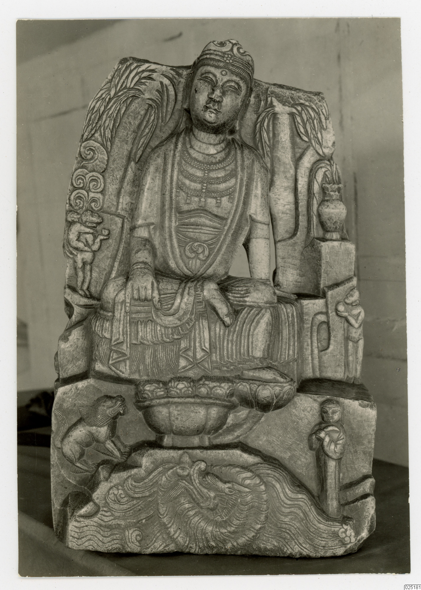 Sittande staty av Bodhisattva Avalokiteshvara på en tron som är sönderoch på tron så finns det en drake och en människoliknande figur med svans och ett barn på ryggen.