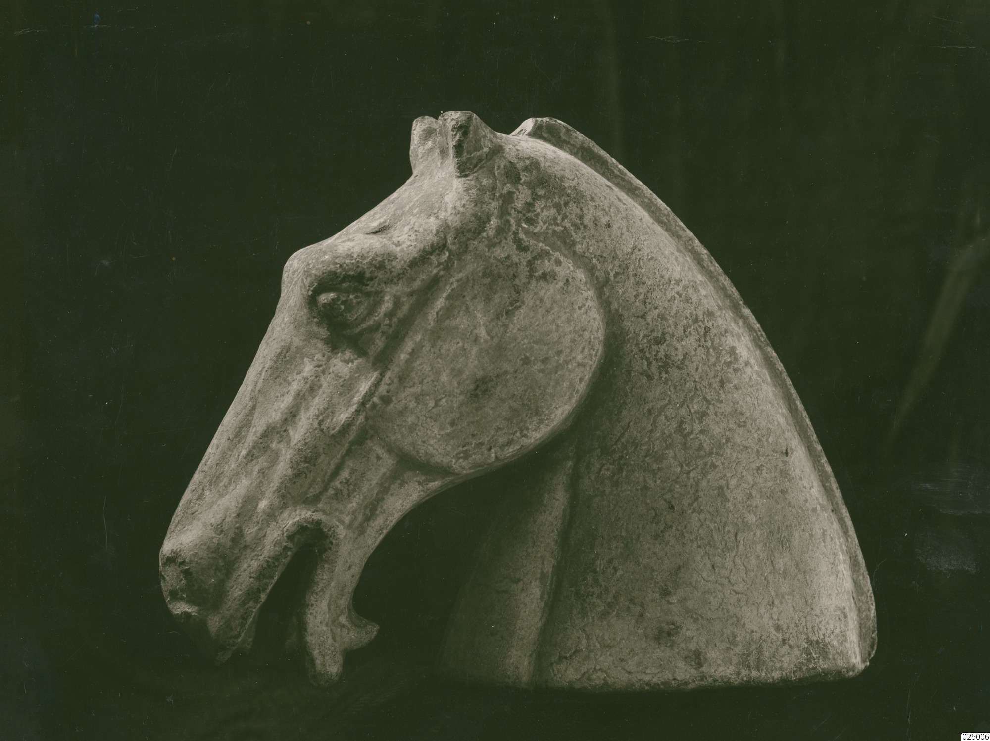 Skulptur utav ett hästhuvud i keramik. Handynastin.