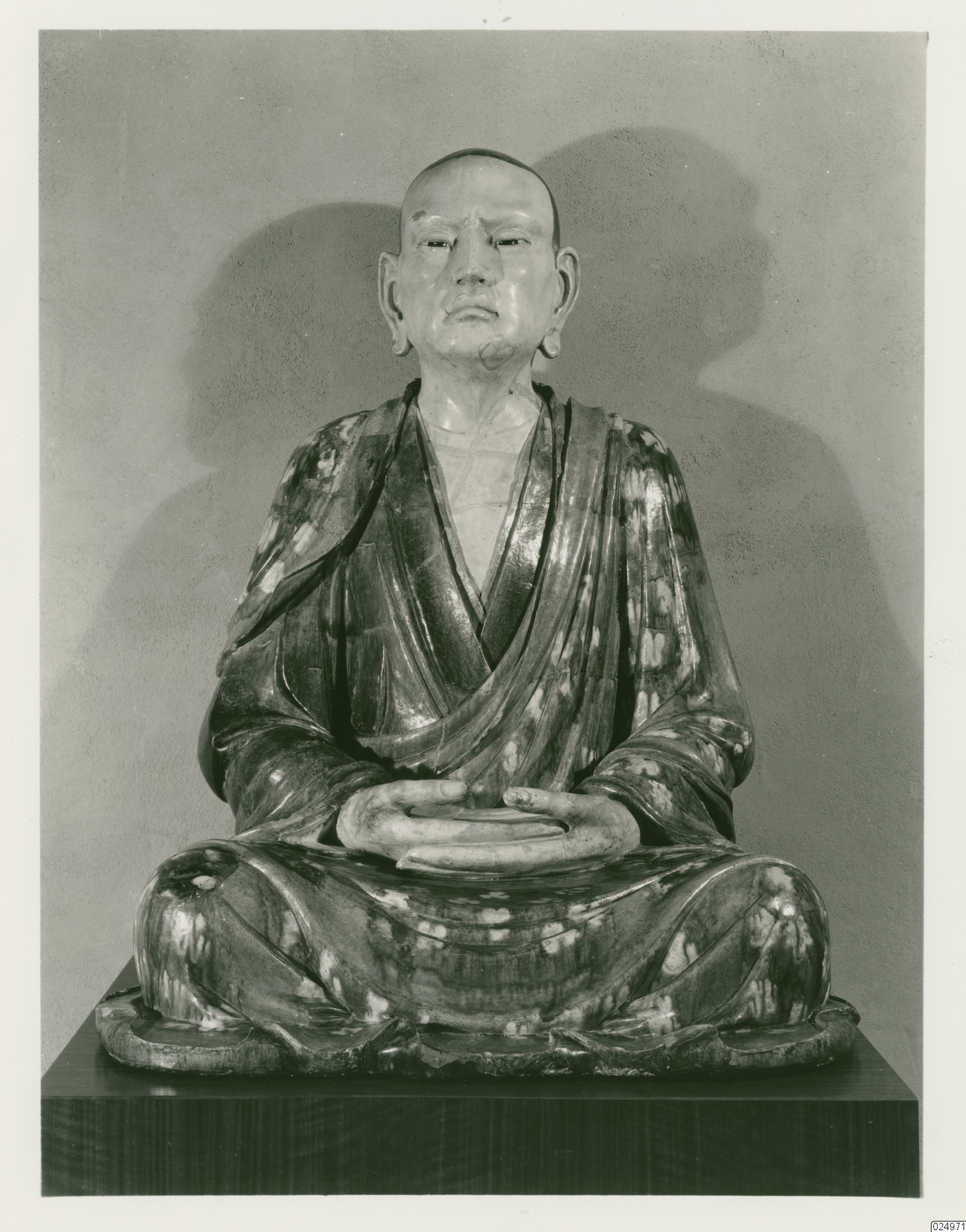 Staty i lera föreställande en Luohan/Lohan/Arahant, sittandes i meditationsställning. Liaodynastin.