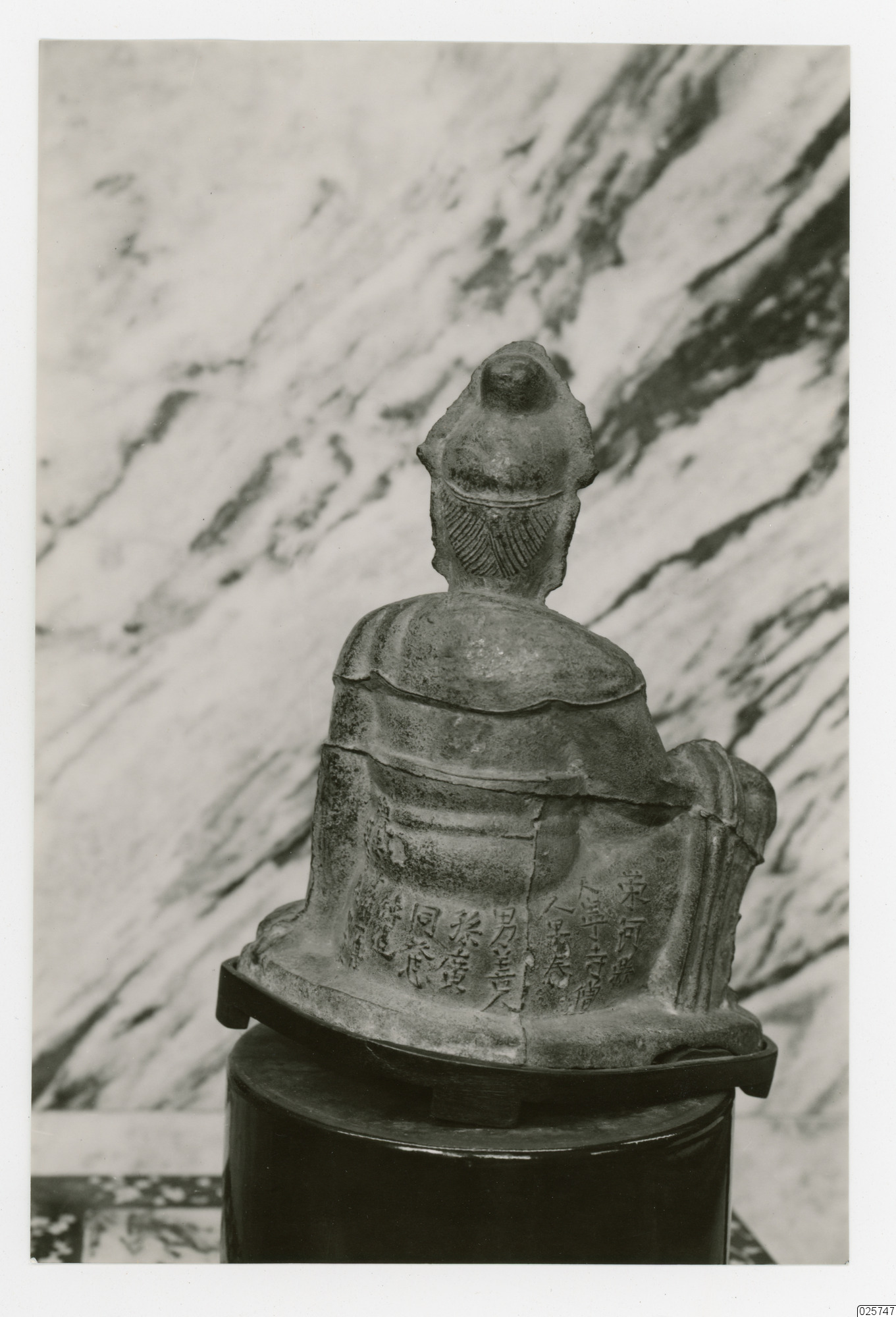 Bild på baksidan av en sittande staty.