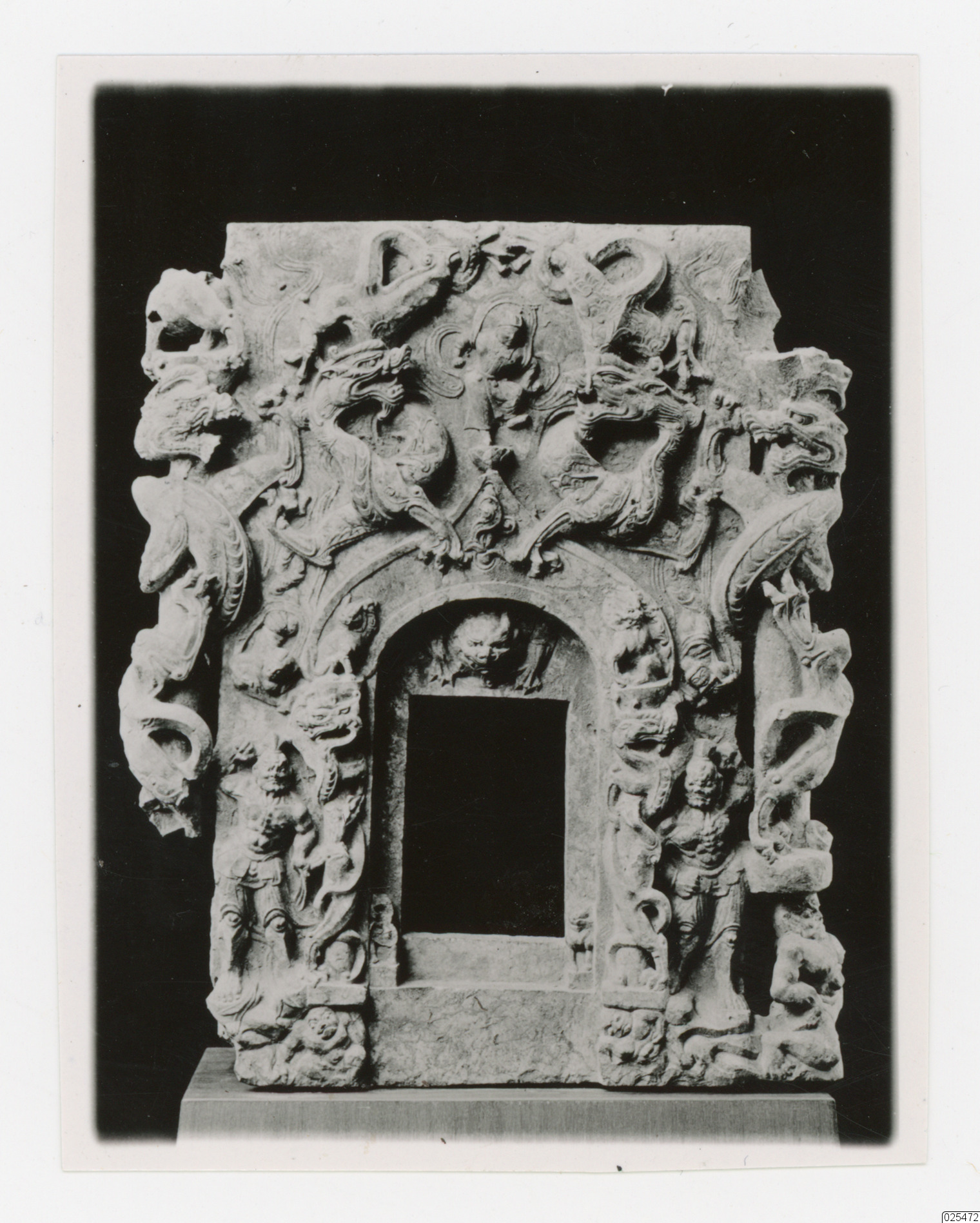 Framväggen på ett buddhistiskt helgedom Kinesisk Sui-dynastin (581-618) till Tang-dynastin (618-906), första kvartalet av 700-talet, hård fin grå kalksten