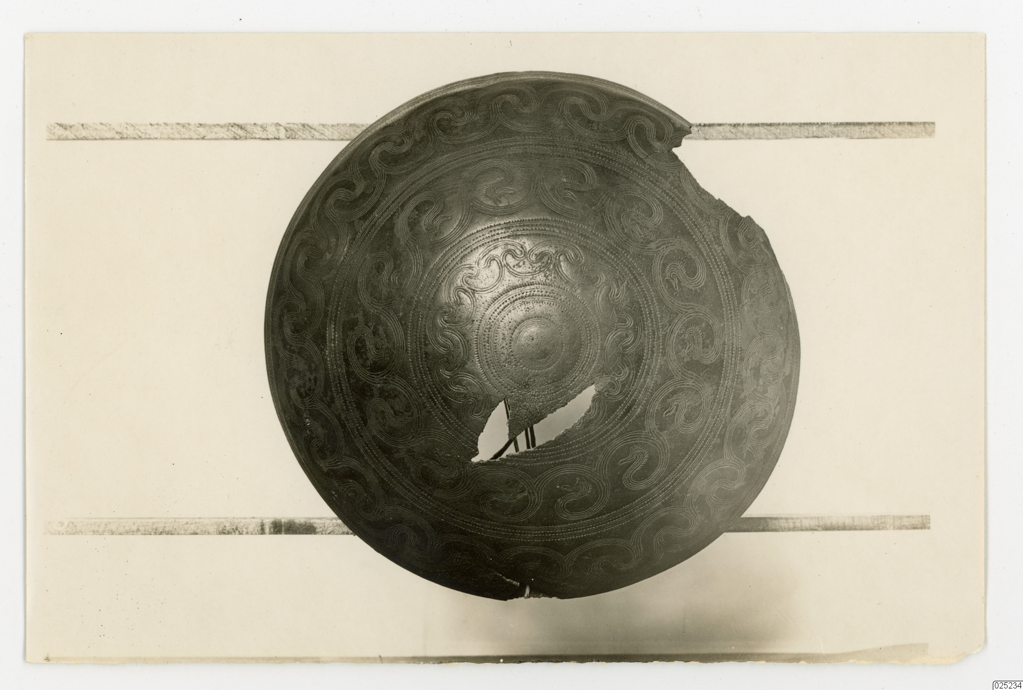 Bild på en sköld som har ett repeterande vågmönster och har blivit skadad på siddan och har ett hål i mitten.
