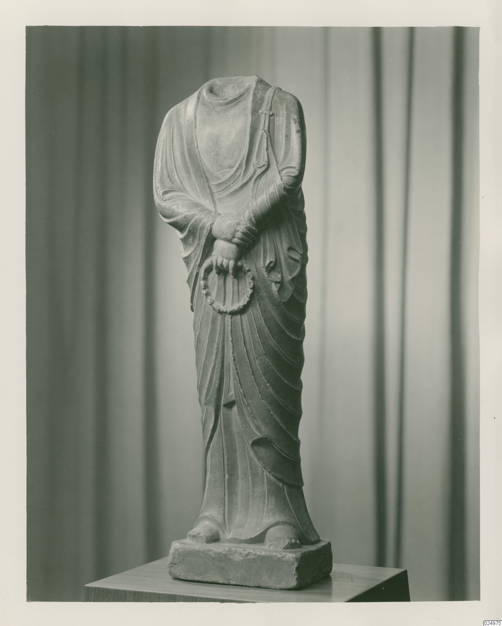 Staty i marmor föreställande en munk som saknar huvud. Tangdynastin.