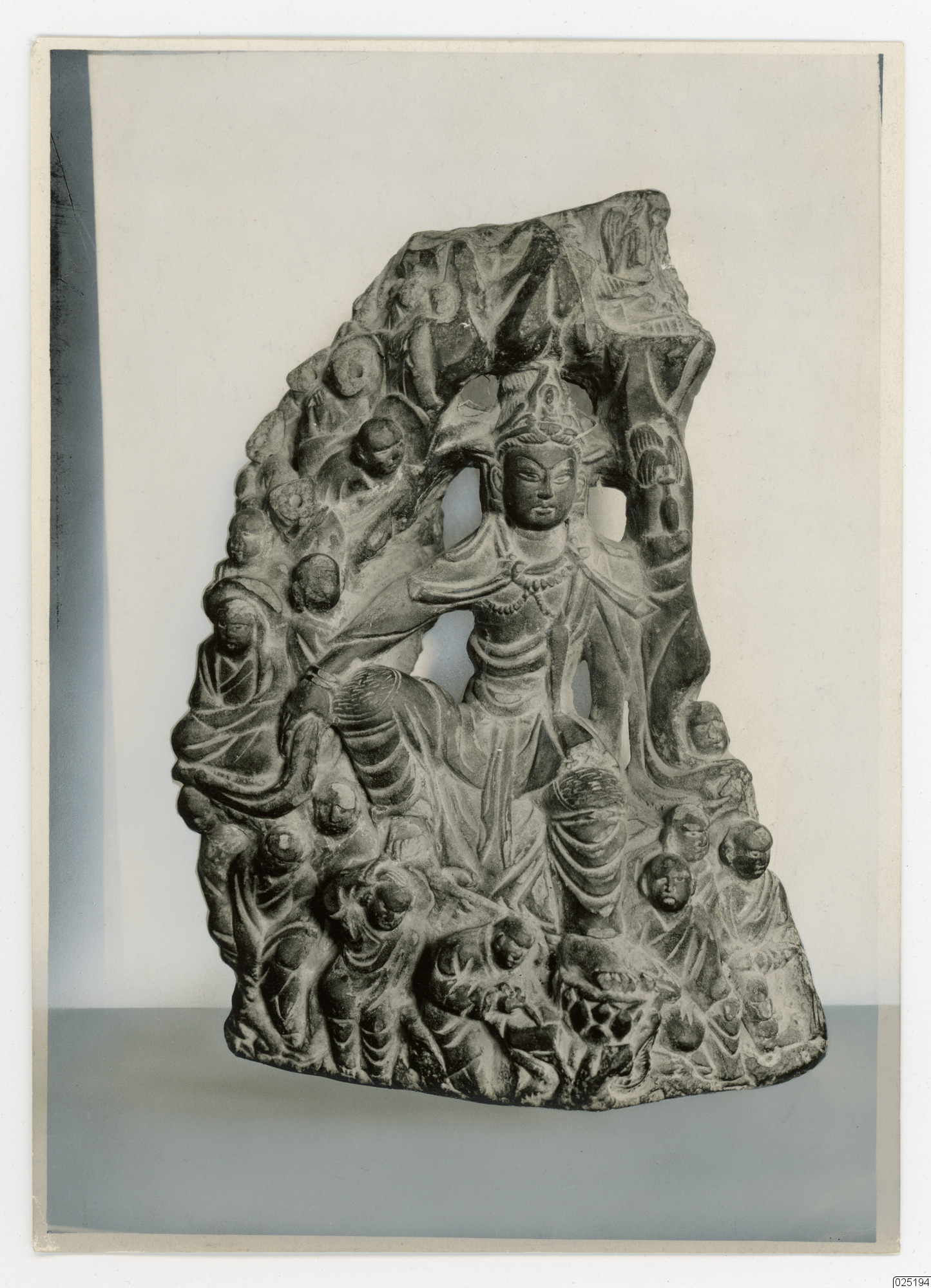 Staty av en Bodhisvattva som är omringad av massor av andra personer