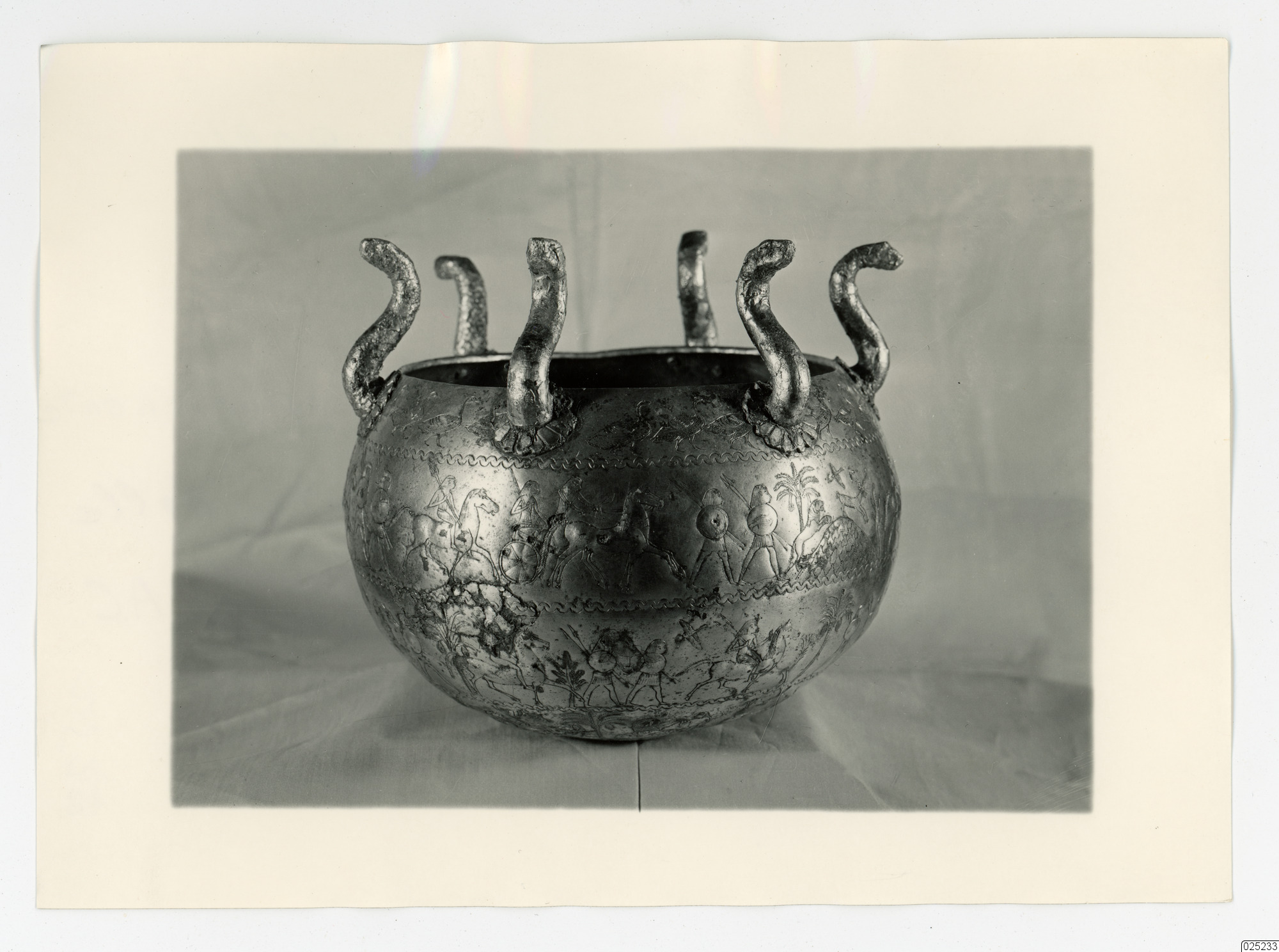 Skål som är dekorerad med krigare och har ormar som sticker ut från toppen.