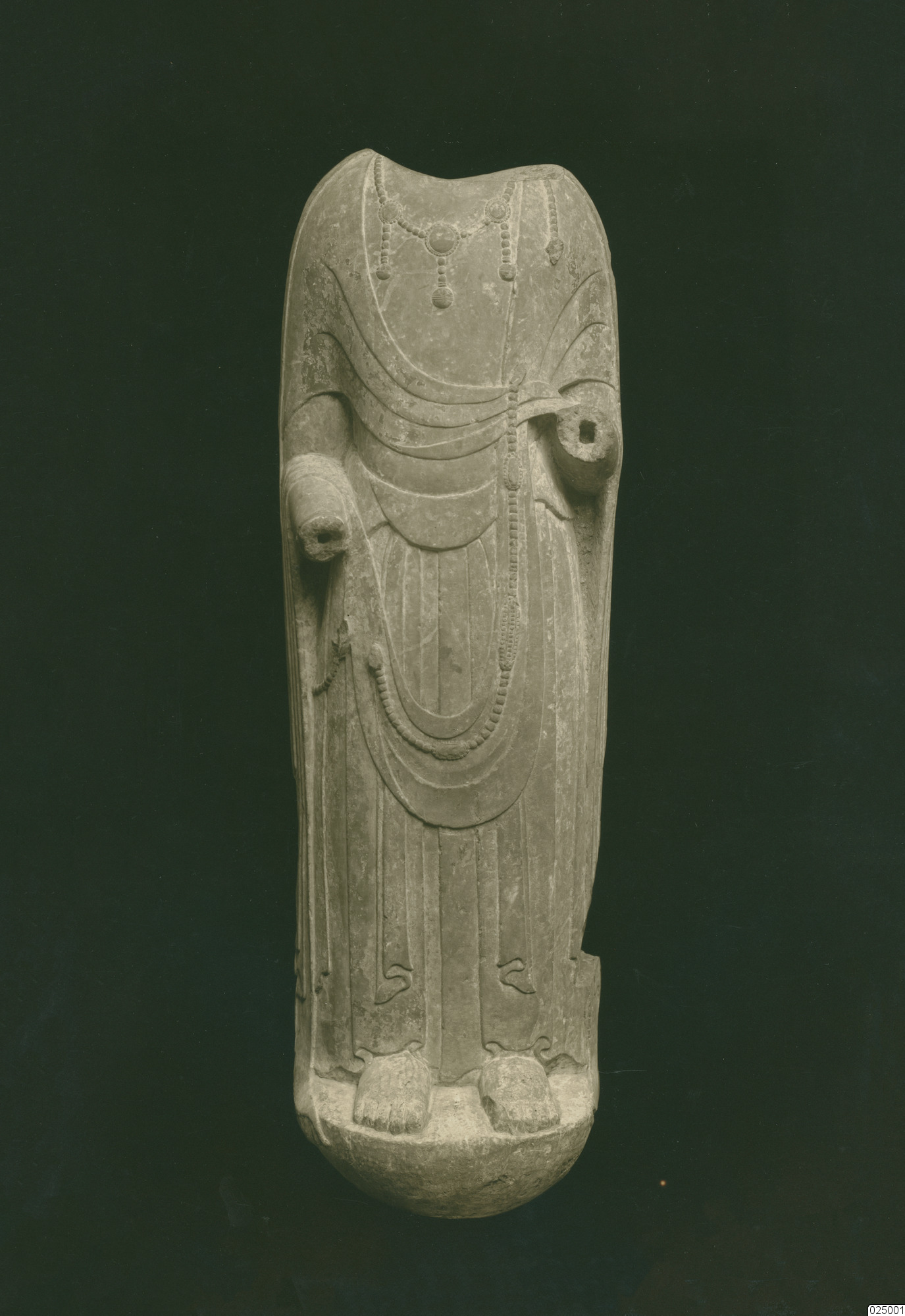 Staty/figur i kalksten av en bodhisattva med avkapade händer samt huvud. Från Hebeiprovinsen. Suidynastin.