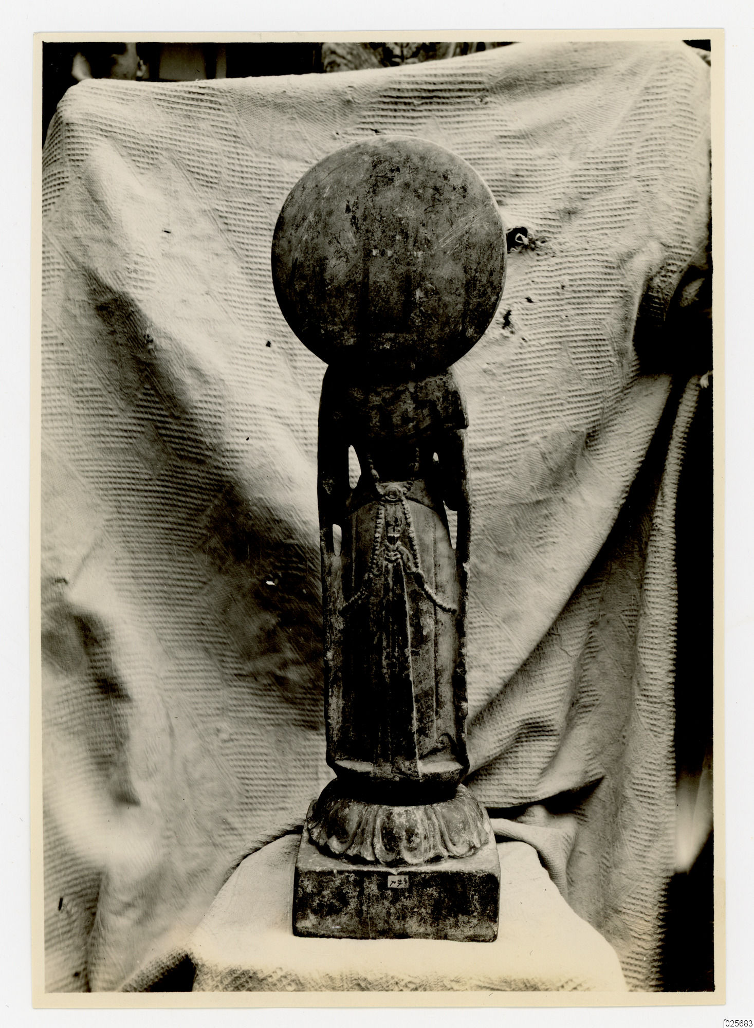 Skulpturen föreställer troligtvis en buddhistisk gudomlighet, möjligen en bodhisattva eller en buddha, med en stor glorieliknande aureola bakom huvudet.
