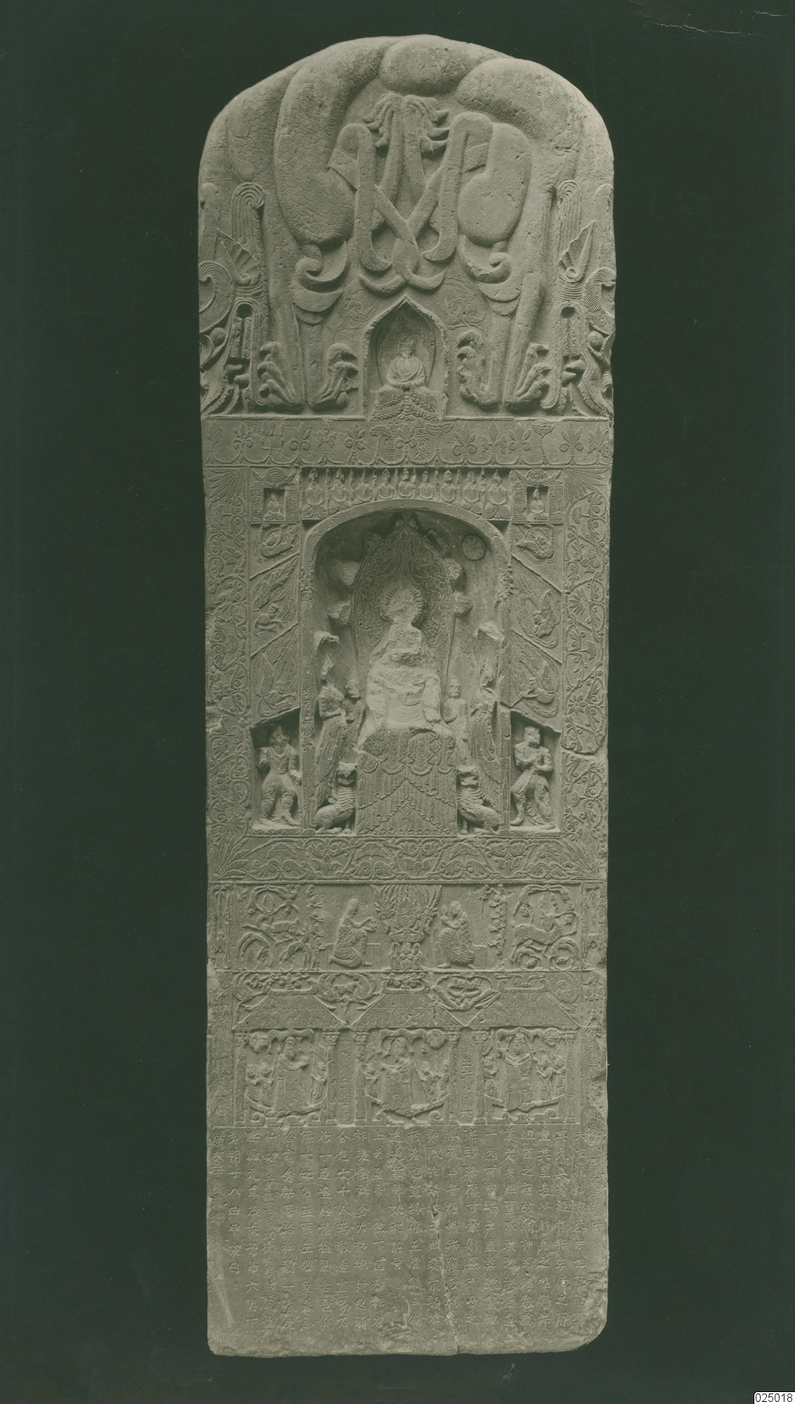 Framsidan av en stele i kalksten. Norra Wei-dynastin.