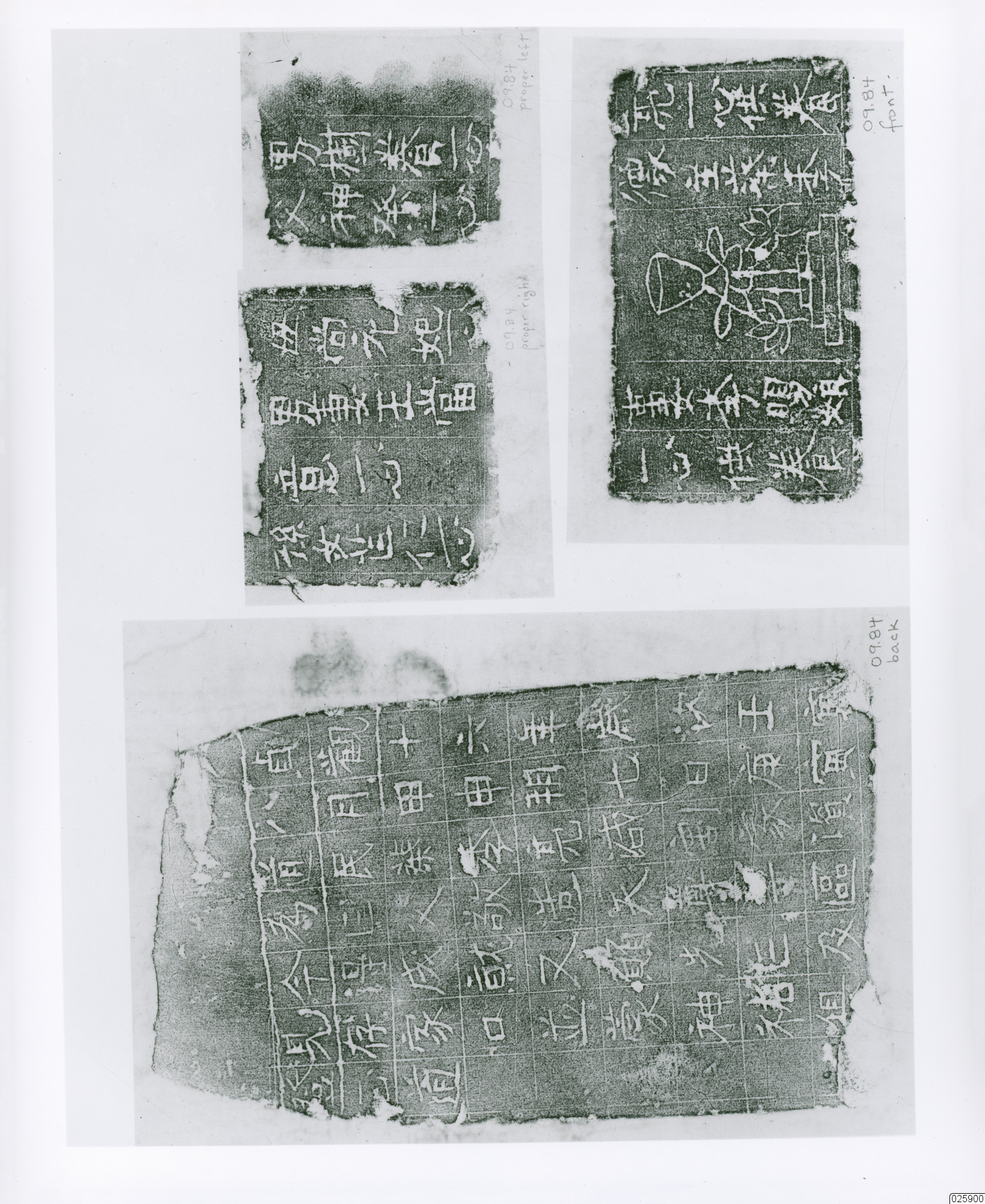 Gnuggbilder av text på baksidan, sidorna och framsidan av en staty. Daoist votive trinity.