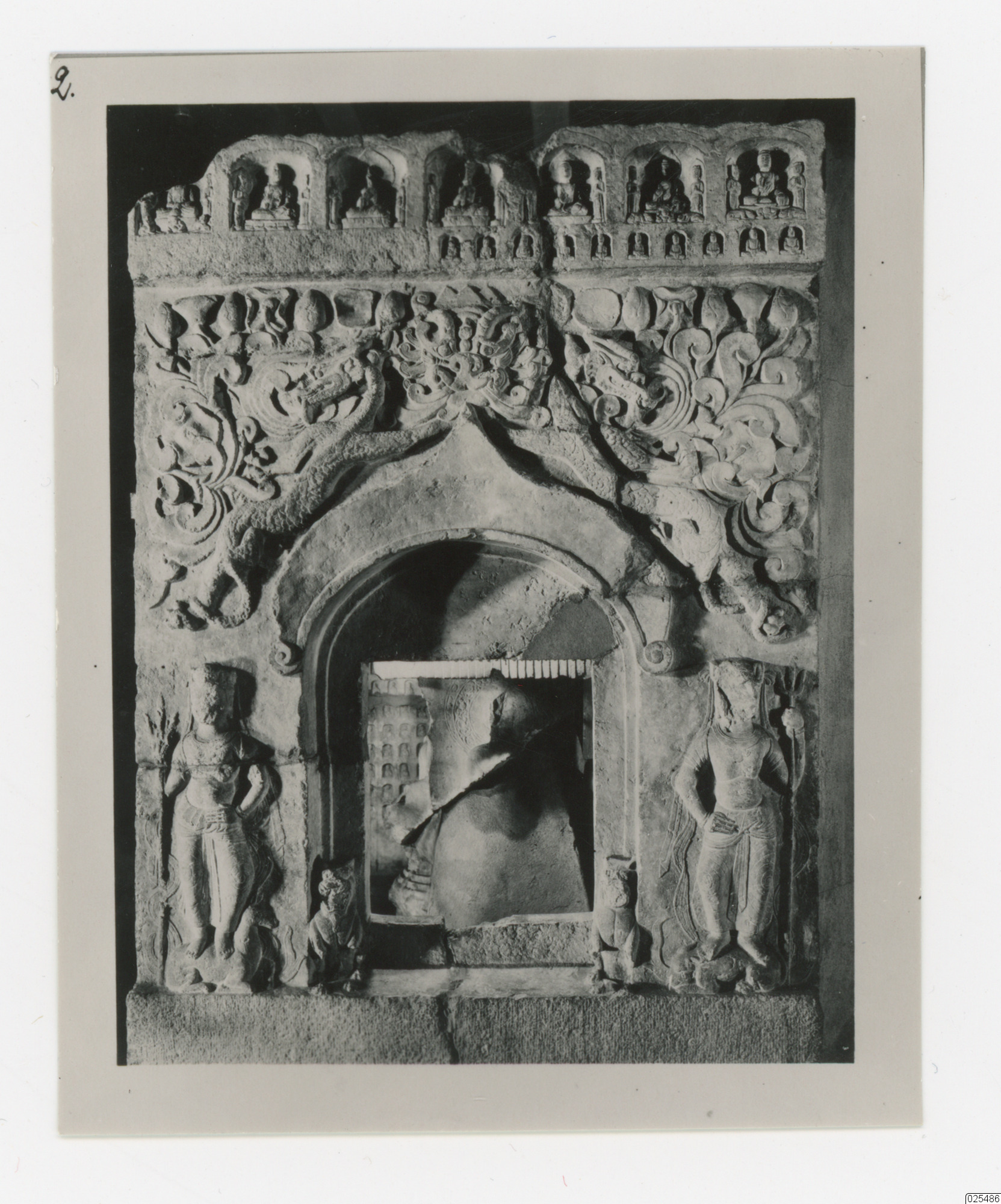 Framväggen på ett buddhistiskt helgedom Kinesisk Sui-dynastin (581-618) till Tang-dynastin (618-906), första kvartalet av 700-talet, hård fin grå kalksten