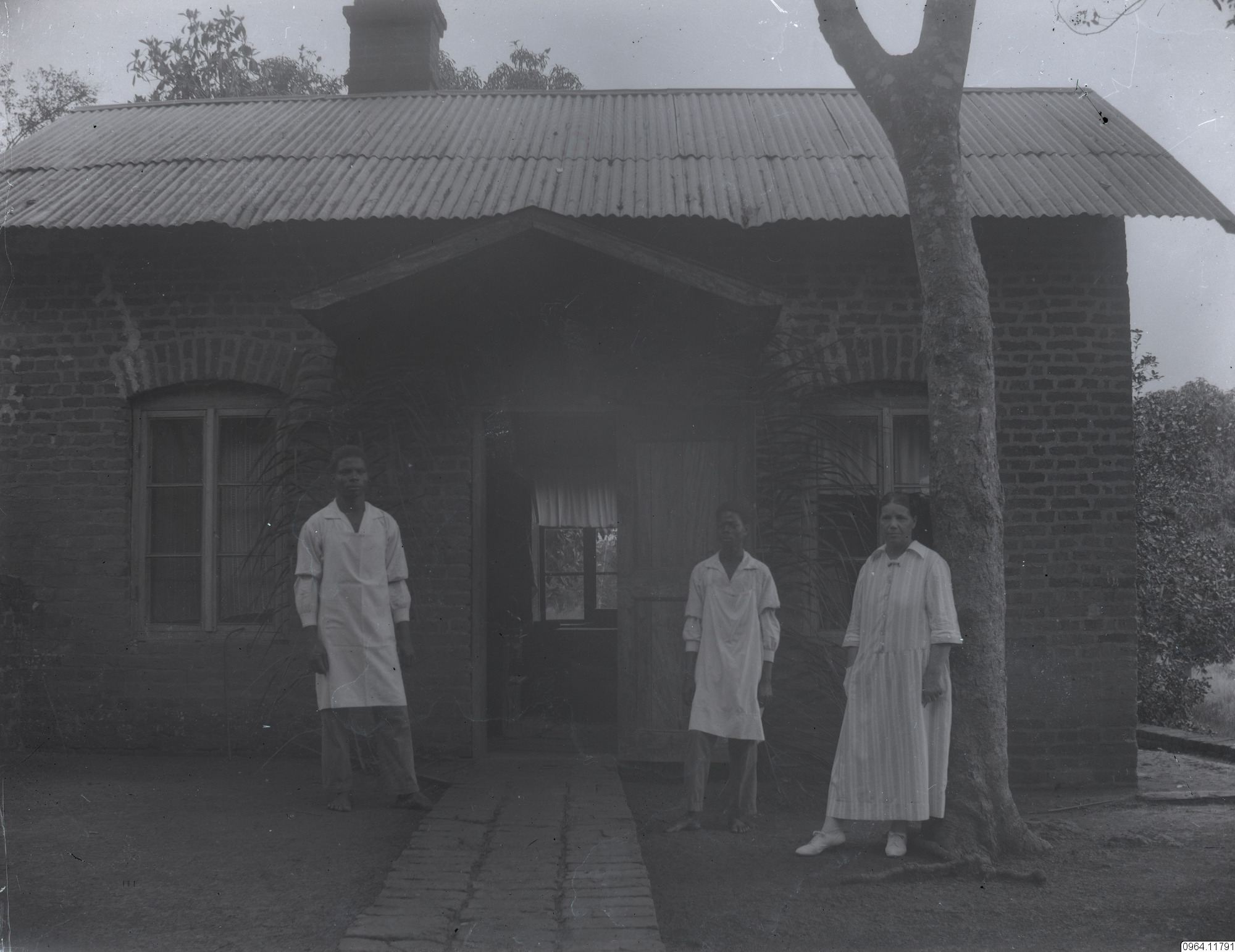 Tre personer utanför mindre hus. Kvinnlig missionär och två män.