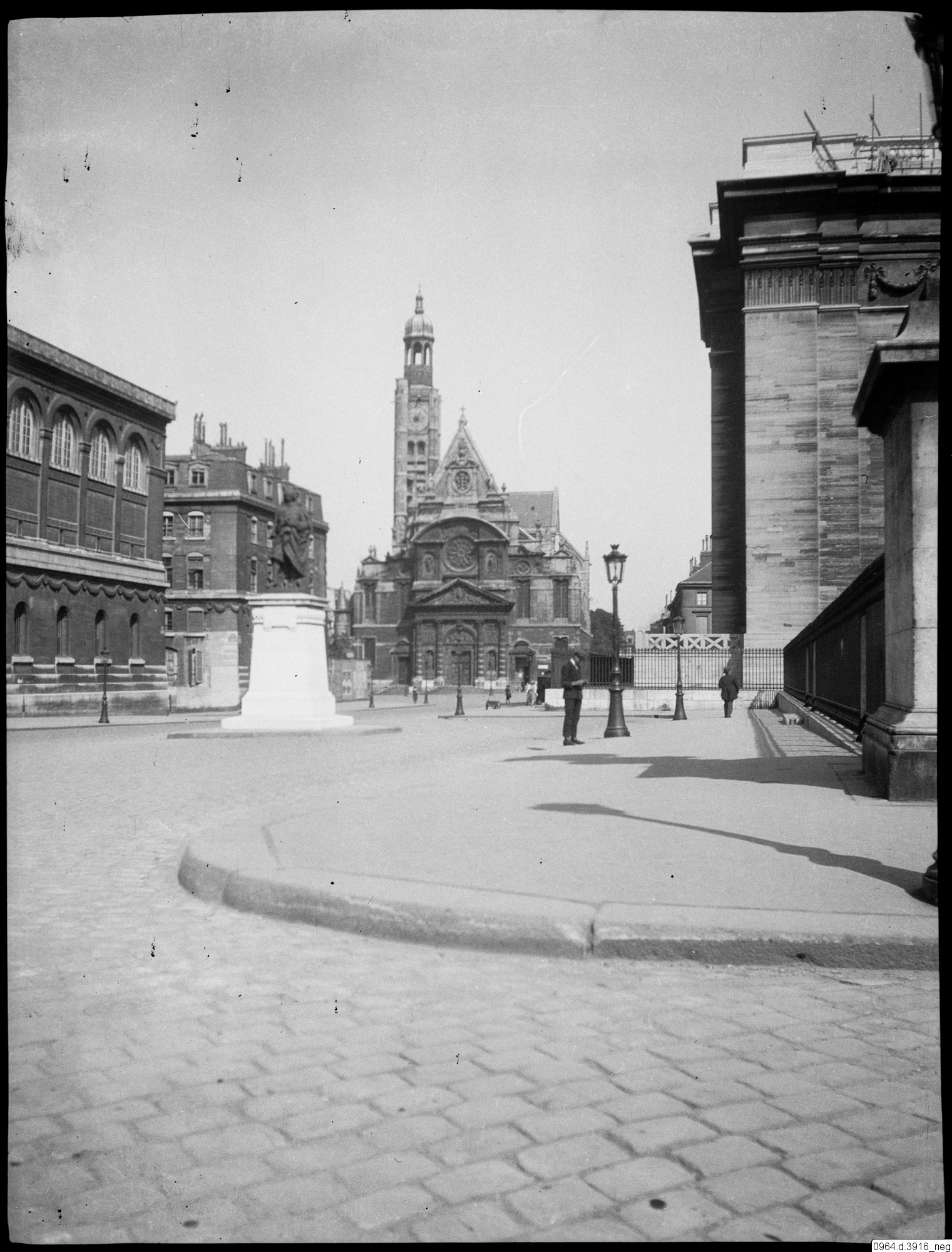 Kyrkan Saint-Étienne-du-Mont i Paris. Sainte-Geneviève biblioteket, tillhörande Sorbonne universitetet till vänster.