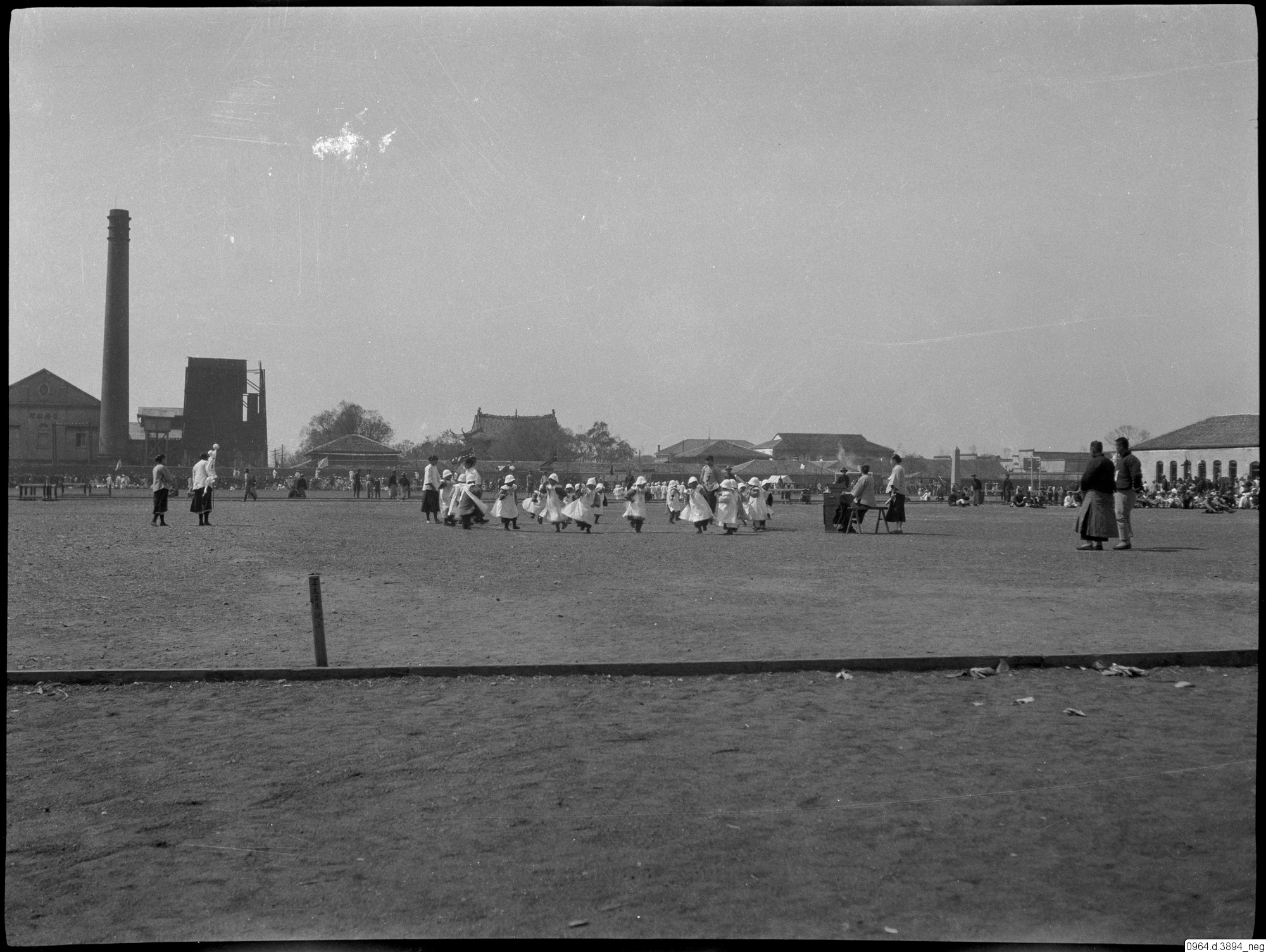 Folksamling och olika aktiviteter. Barn som dansar i ring till pianomusik.