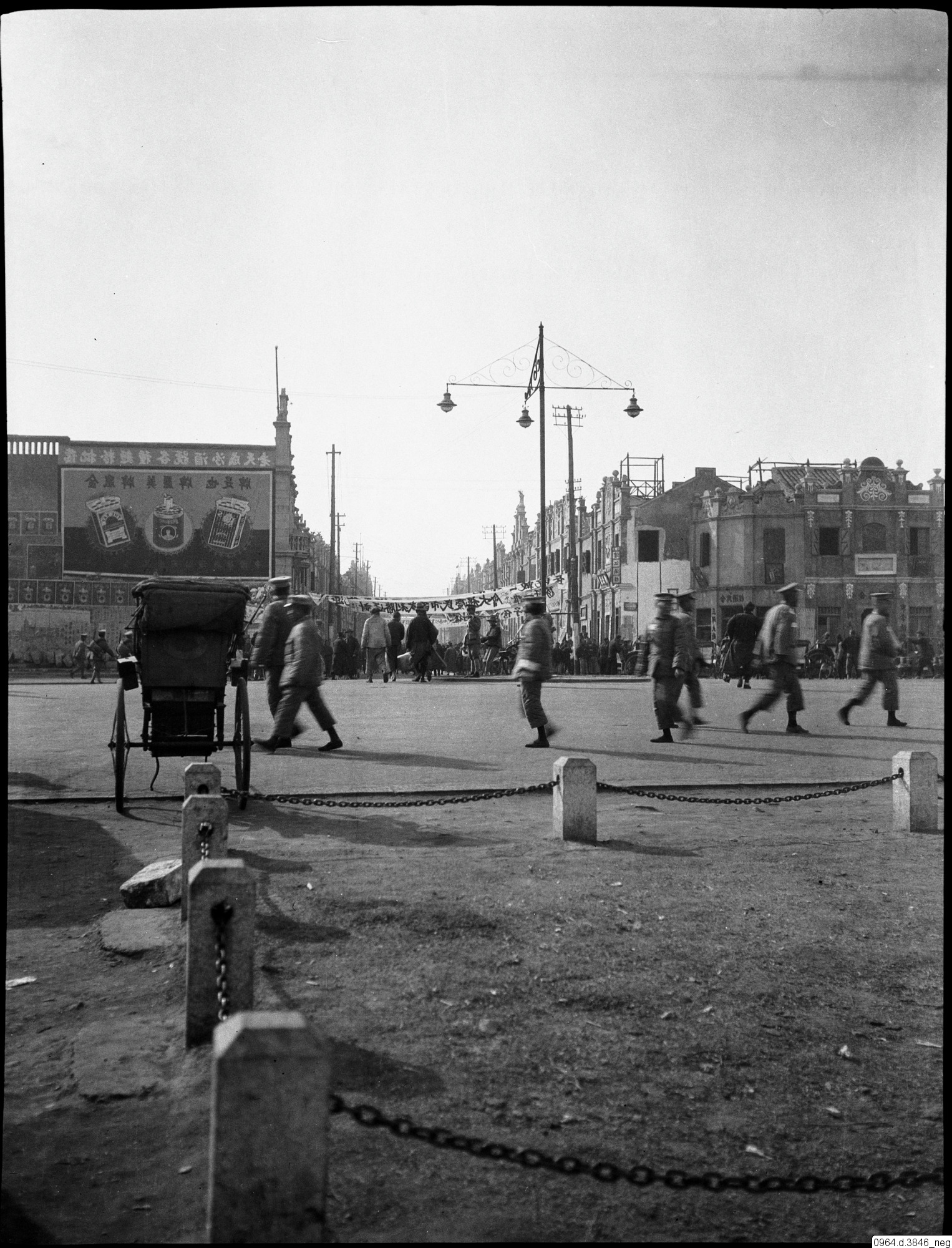 Gatubild. Byggnader och människor. Uniformerade personer.
