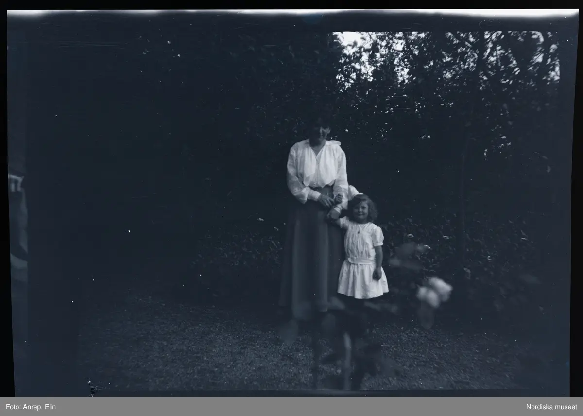 En kvinna och en flicka porträtterade i trädgården till Villa Solveden, Djursholm.