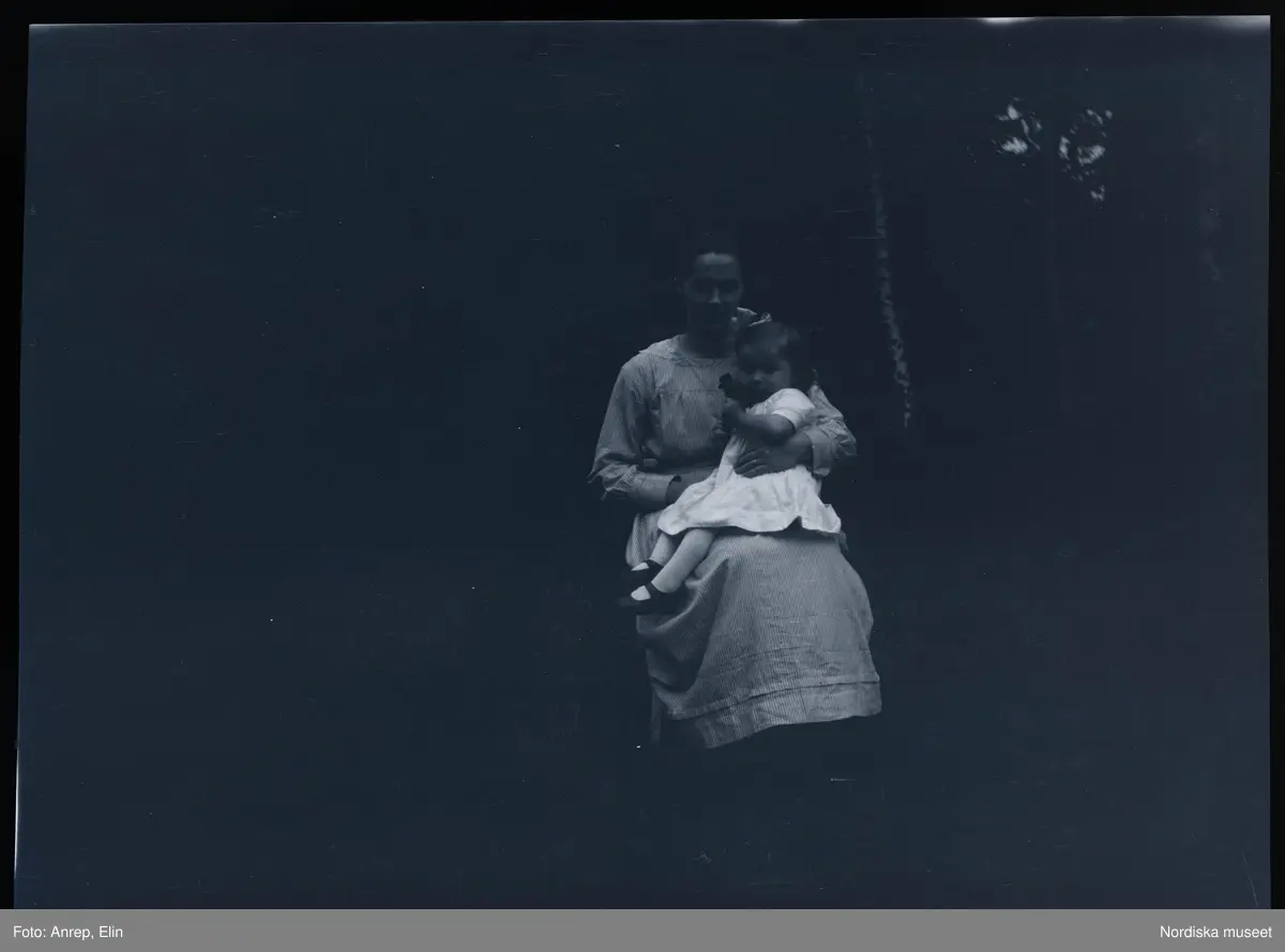 En kvinna med en lite flicka i knät porträtterade i trädgården till Villa Solveden, Djursholm.
