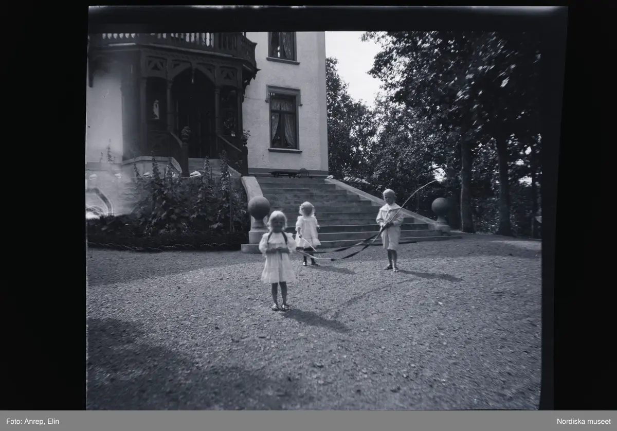 Syskonen Sven, Elsa och Gudrun leker framför familjen Morthensens villa Solveden, Djursholm.