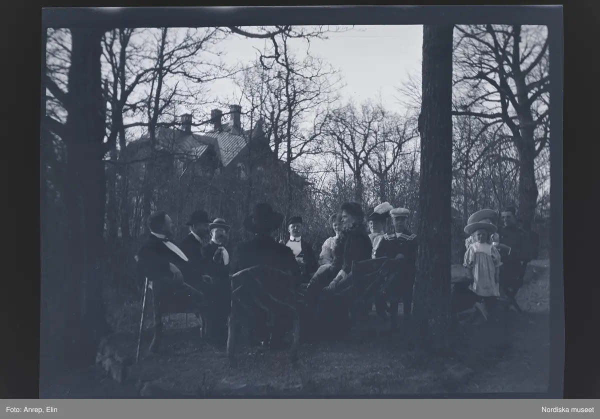 Ett sällskap sitter samlade i trädgårdsmöblerna vid villa Solveden, Djurholm.