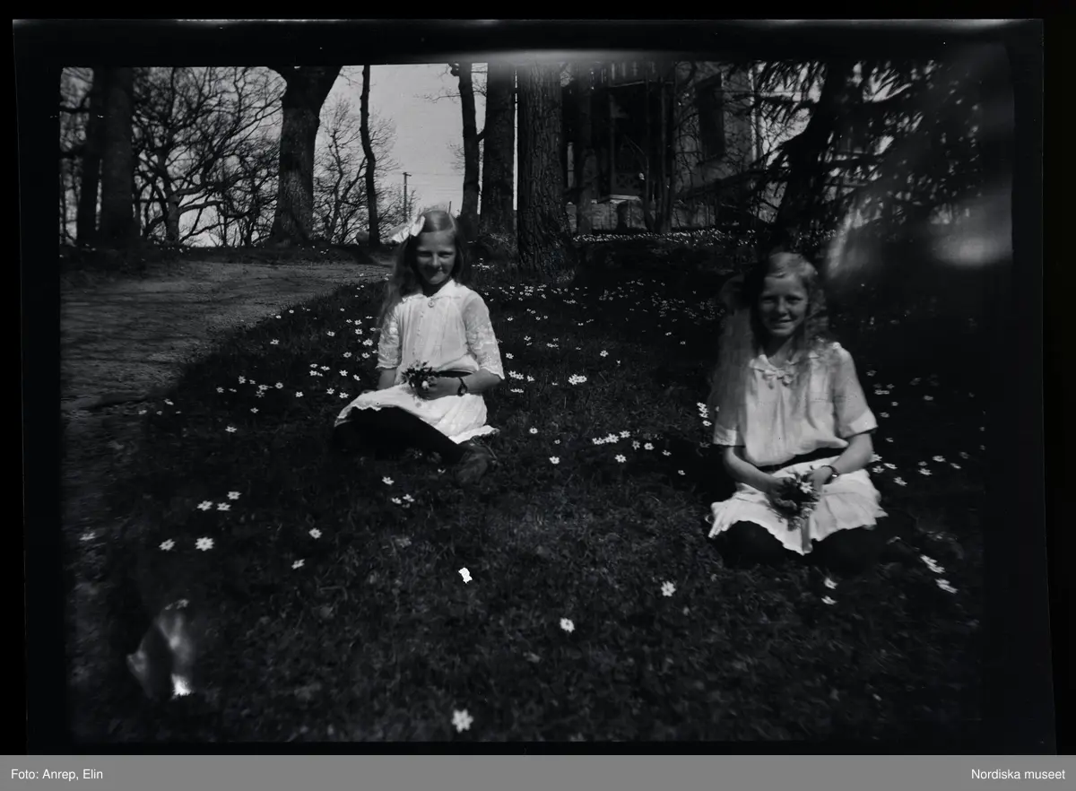 Elsa och Gudrun har plockat vitsippor på tomten till familjen Morthensens villa Solveden, Djursholm.