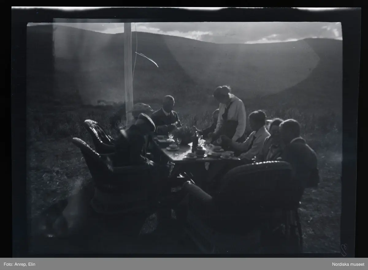 Ett sällskap sitter runt ett bord och dricker kaffe och avec, utomhus.