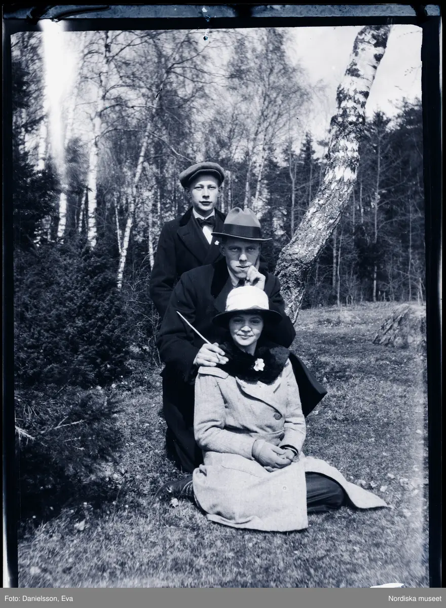 Tre personer porträtterade utomhus. En kvinna sitter längst fram, en man sitter bakom med handen på hennes axel, och bakom dem står en pojke.
