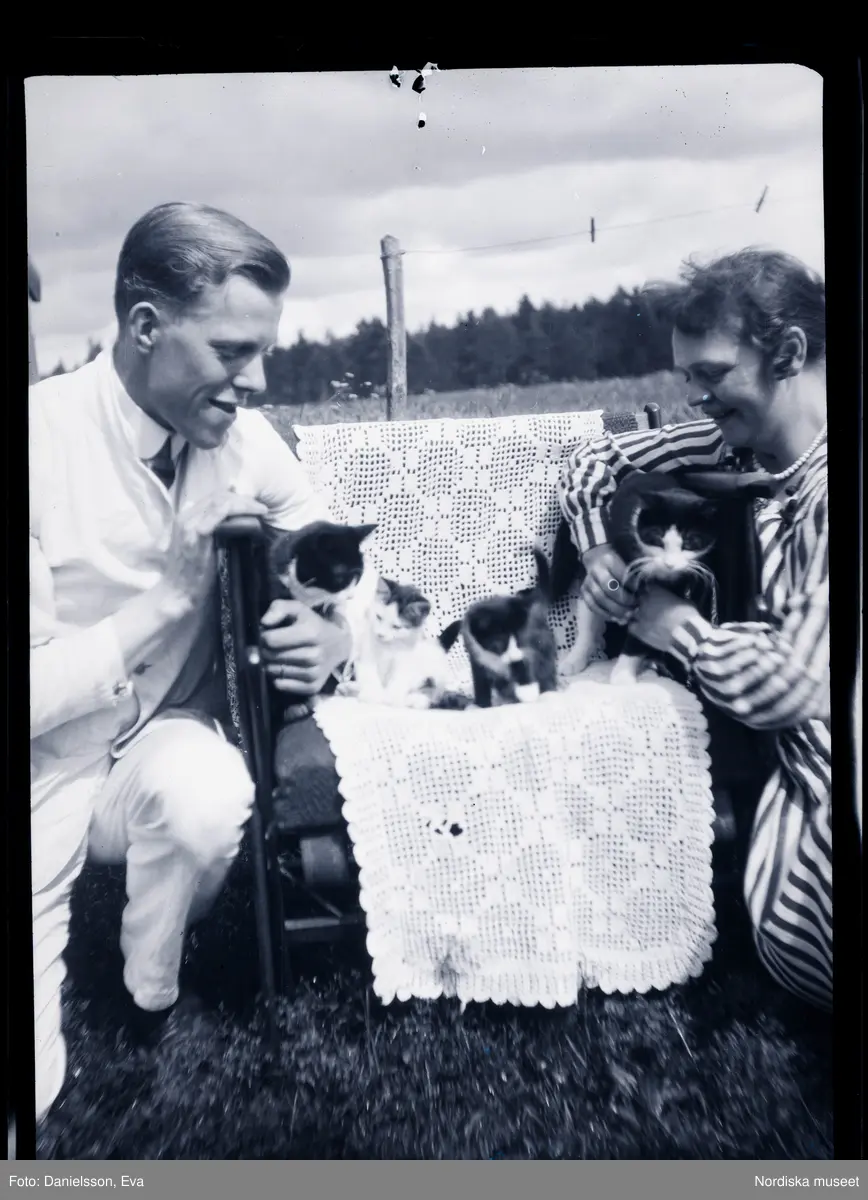 En man och en kvinna försöker få några katter att posera i en karmstol, utomhus.