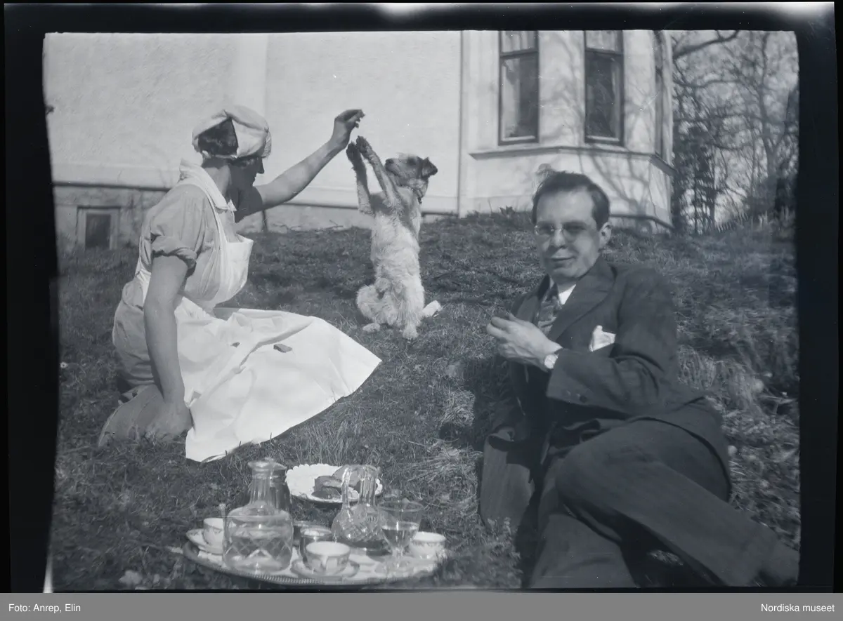 Kaffe i trädgården. Sven ligger i gräset till familjen Morthensens villa Solveden, Djursholm. En tjänstekvinna låter en hund smaka mot att den sitter fint.