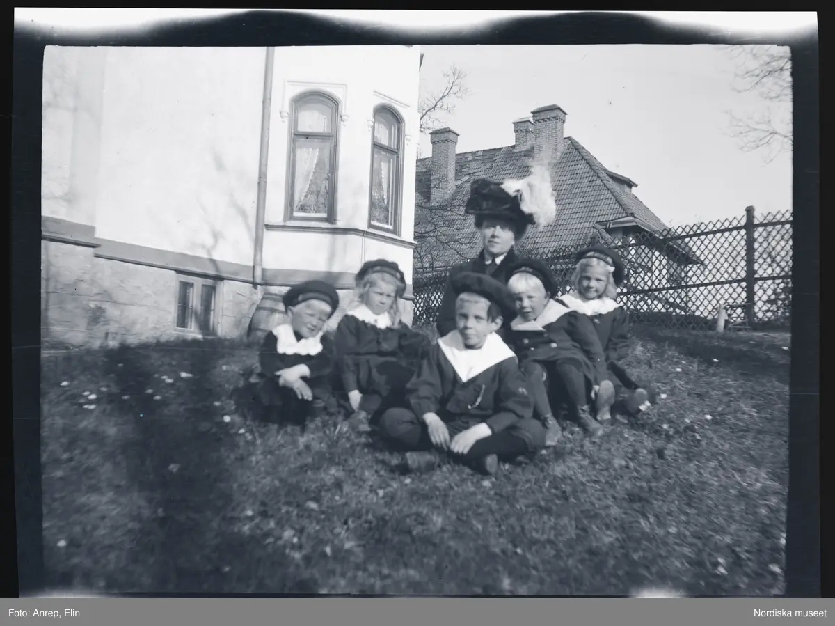 Elin Morthensen (född Anrep) med de fem barnen. Utanför familjen Morthensens villa Solveden, Djursholm.