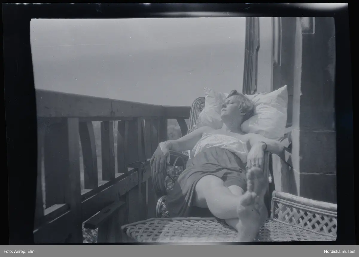 En kvinna ligger och solar sig eller vilar i en länstol på en balkong.