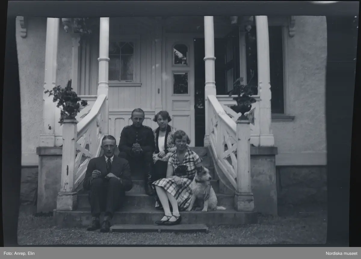 Ett sällskap sitter på trappan till familjen Morthensens villa Solveden, Djursholm. Elin Morhensen (född Anrep) överst t.h.