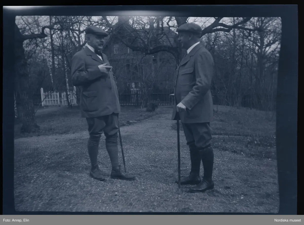 Två män iklädda promenadkläder med käppar vid Villa Solveden, Djursholm.
