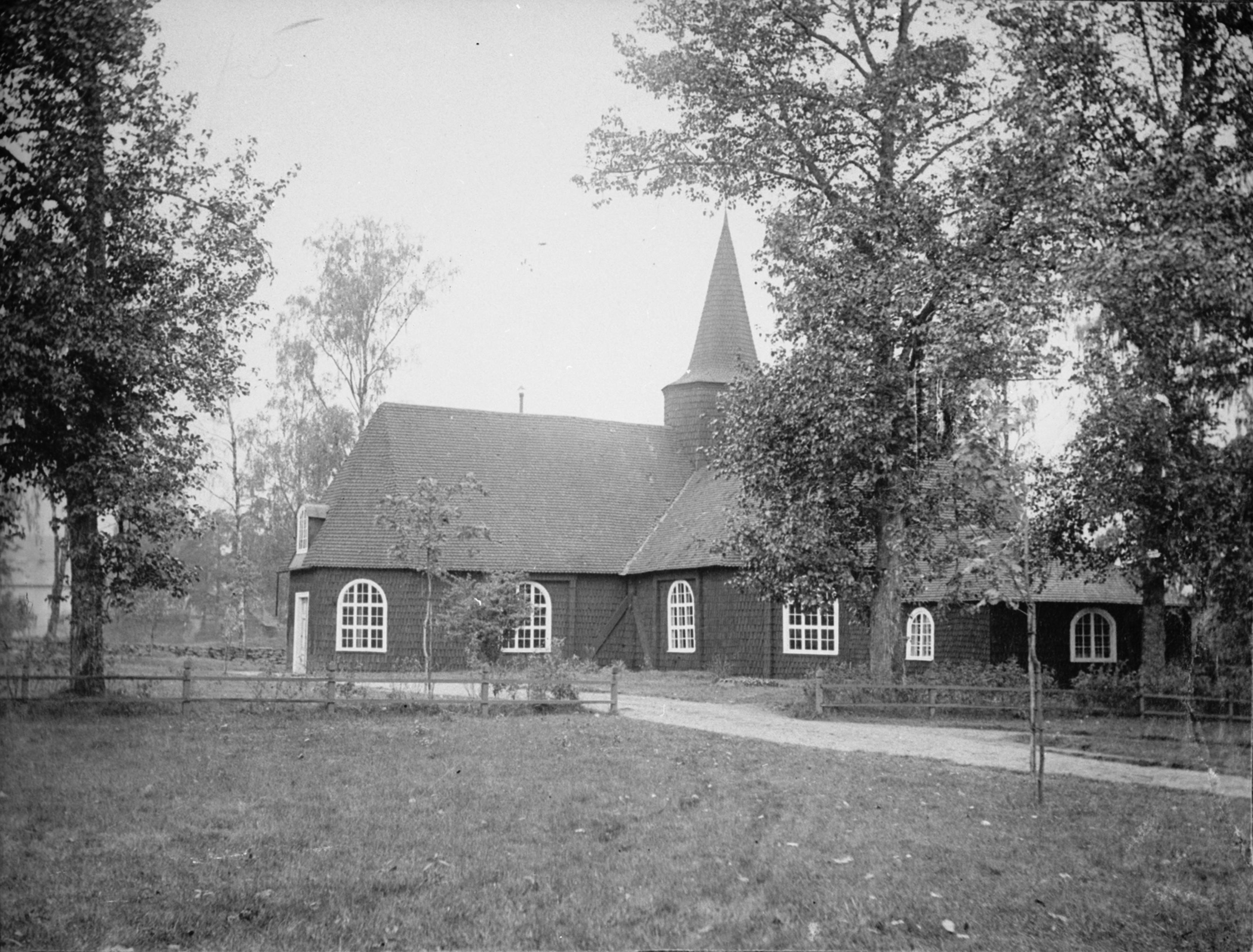 Kyrkan från syd. Spånklädd träkyrka i korsform med spira.