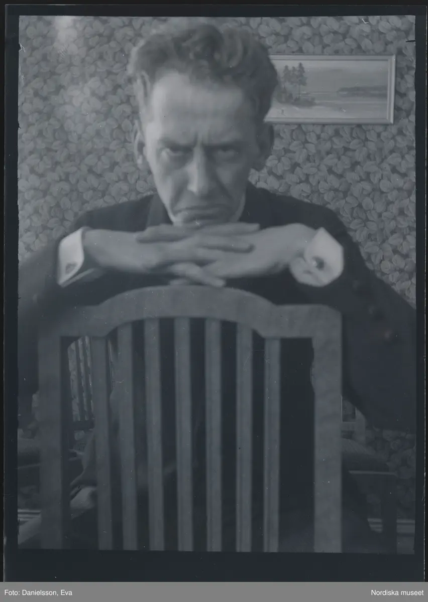 Humoristiskt porträtt av en man som sitter bakvänd på en stol och gör en arg grimas.