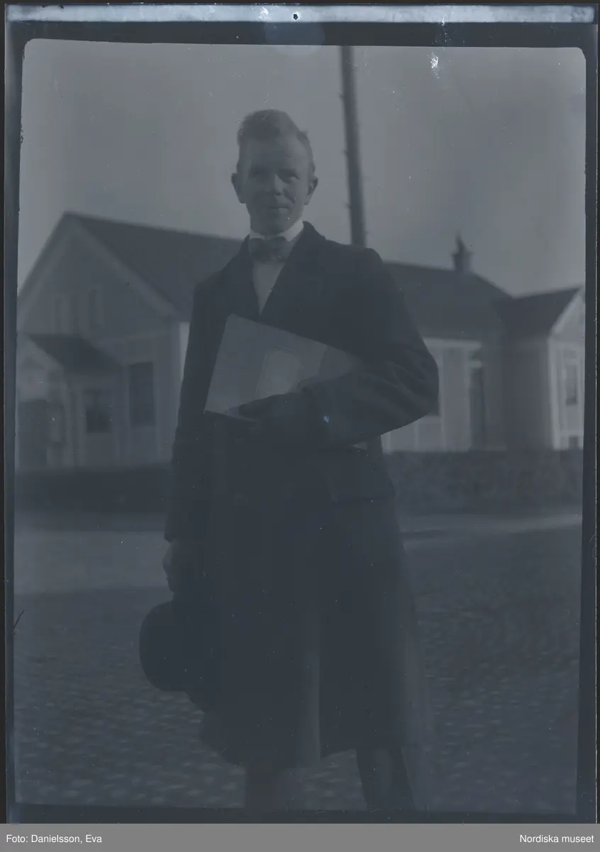 En välklädd man står ute på gatan med en anteckningsbok under armen.