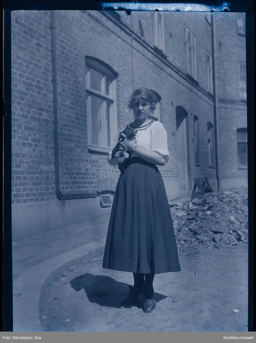 Porträtt av en ung kvinna som står utanför ett hus. Hon håller en hundvalp i famnen.