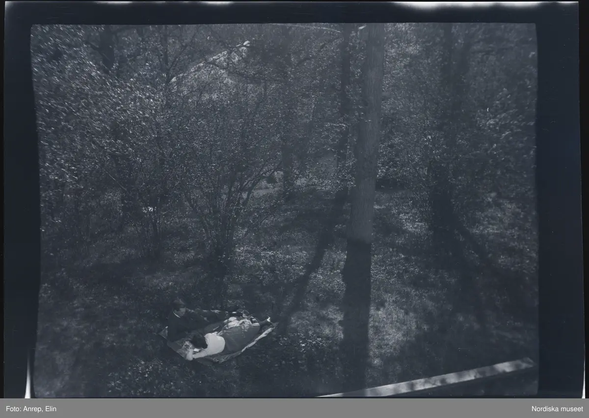Vy över tomten till familjen Morthensens villa Solveden, Djursholm. En ung man och kvinna ligger på en filt i gräset.
