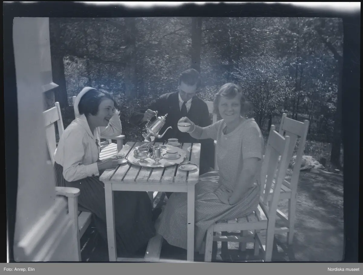 Fika. Elsa, Sven och vänner sitter utanför familjen Morthensens villa Solveden, Djursholm och dricker kaffe.