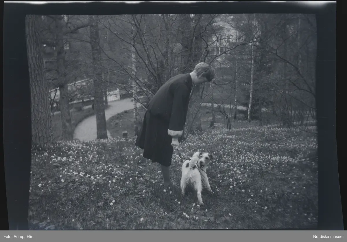 En av döttrarna leker med en hund bland vitsippor på tomten till familjen Morthensens villa Solveden, Djursholm.