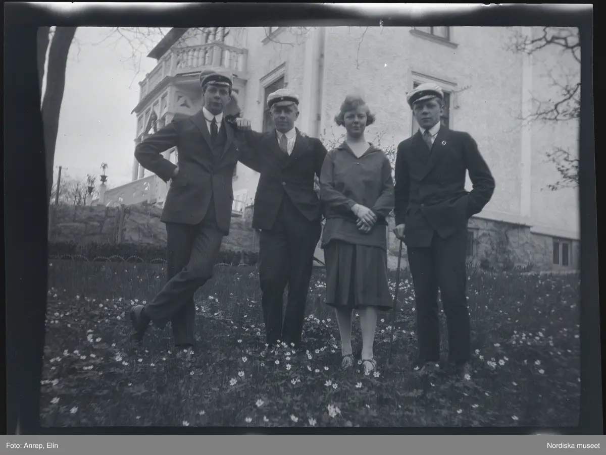 De tre bröderna Morthensen, Sven, Birger och Gunnar med sin syster utanför familjens villa Solveden. Bröderna bär studentmössor.
