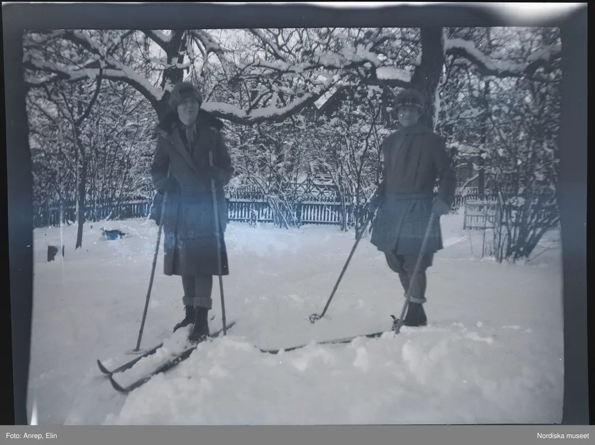 Titel: Två kvinnor på skidor, på tomten till familjen Morthensens villa Solveden, Djursholm.