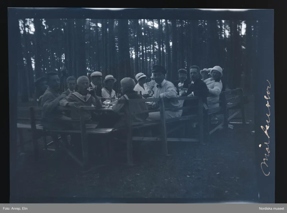 Ett stort sällskap fikar vid ett bord, utomhus bland tallar. Fotografens anteckning på negativet "Mårtensson"