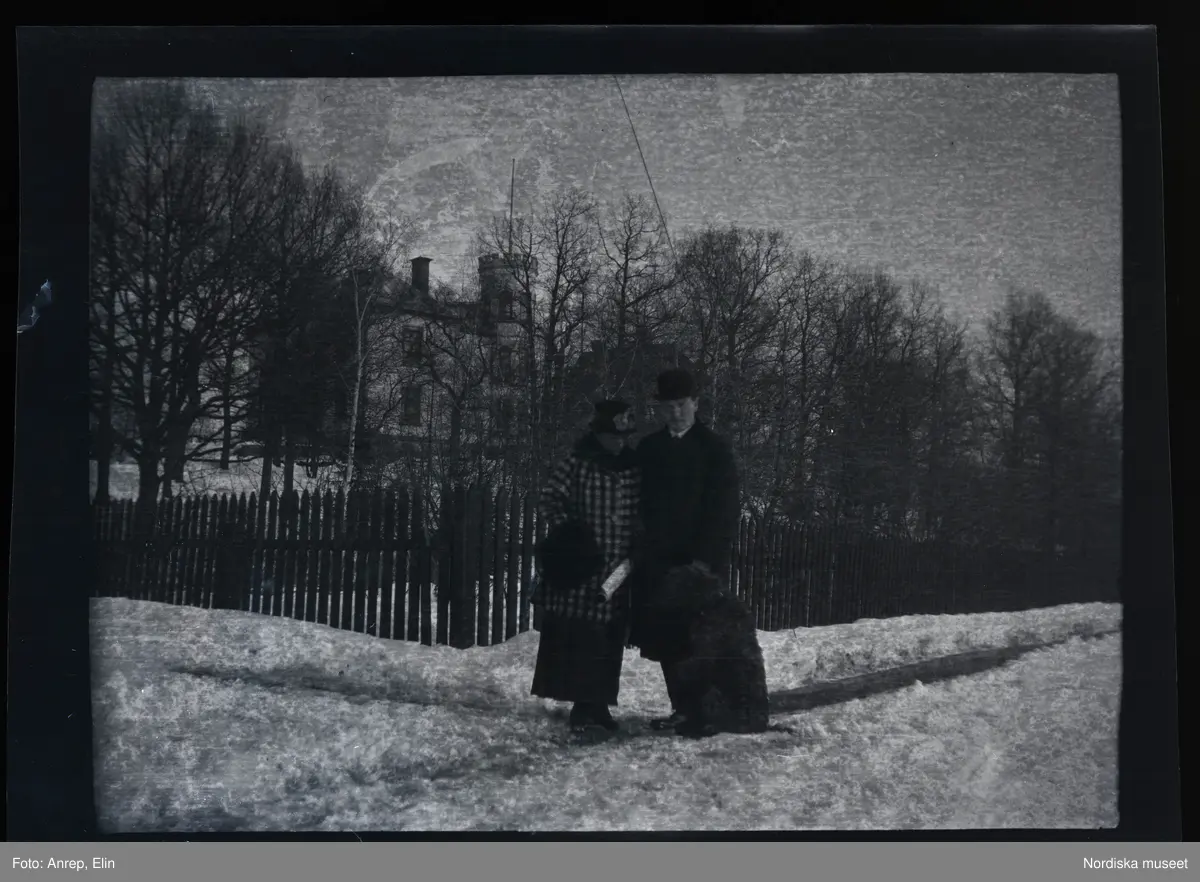 En kvinna, man och hund. I bakgrunden Villa Solveden, Djursholm.