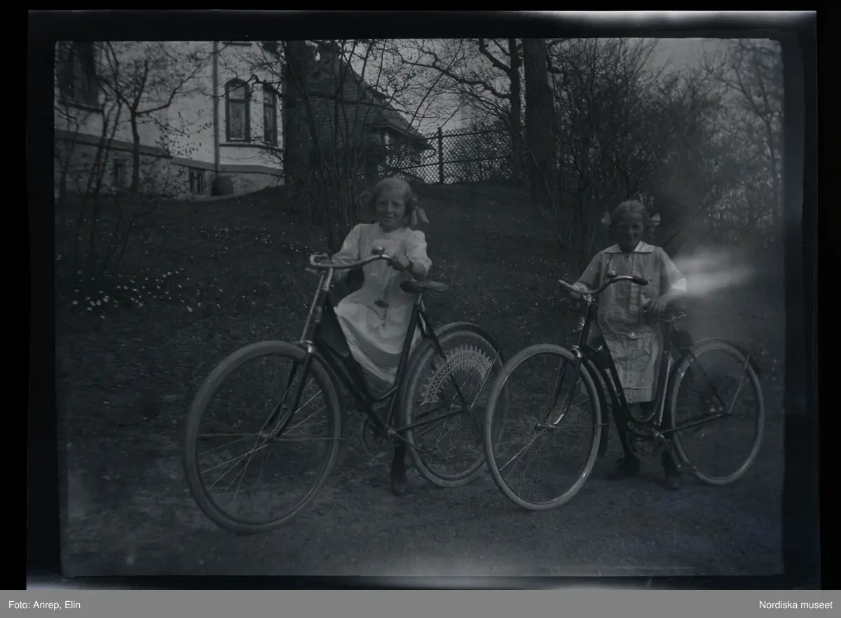 Elsa och Gudrun med sin cyklar framför familjen Morthensens villa Solveden, Djursholm.