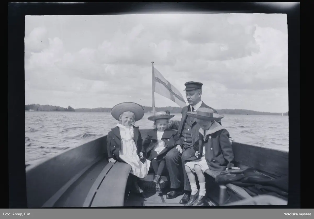 Leonarth Morthensen kör barnen Elsa, Gudrun och Sven i familjens båt.
