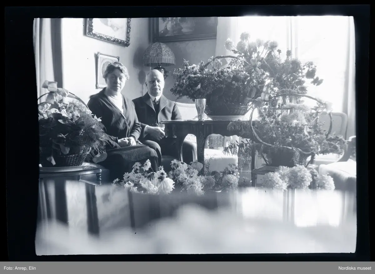Elin (född Anrep) och Leonarth Morthensen sitter omgivna av uppvaktningsblommor. Troligen kring firandet av Elins 50-års dag.
