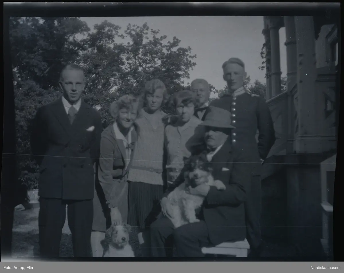Titel: Grupporträtt av familjen Morthensen, utanför familjens villa Solveden, Djursholm.
